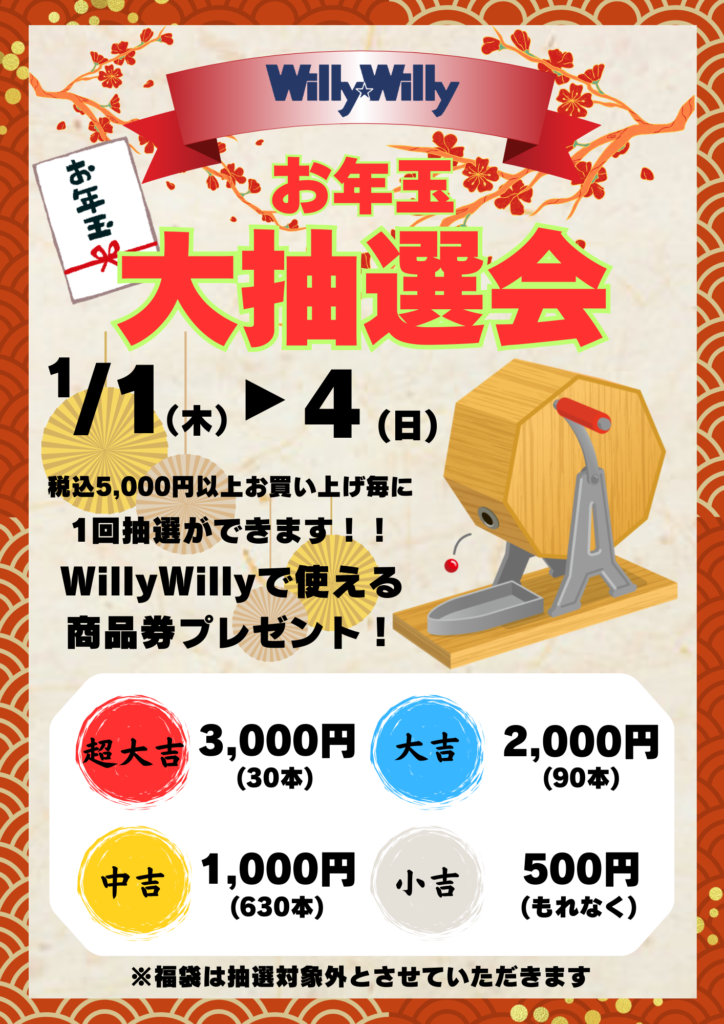 1月1日〜1月4日の期間中、税込5,000円お買い上げ毎に、ウイリーウイリー全店で使える商品券が当たるガラポンを1回行えます。