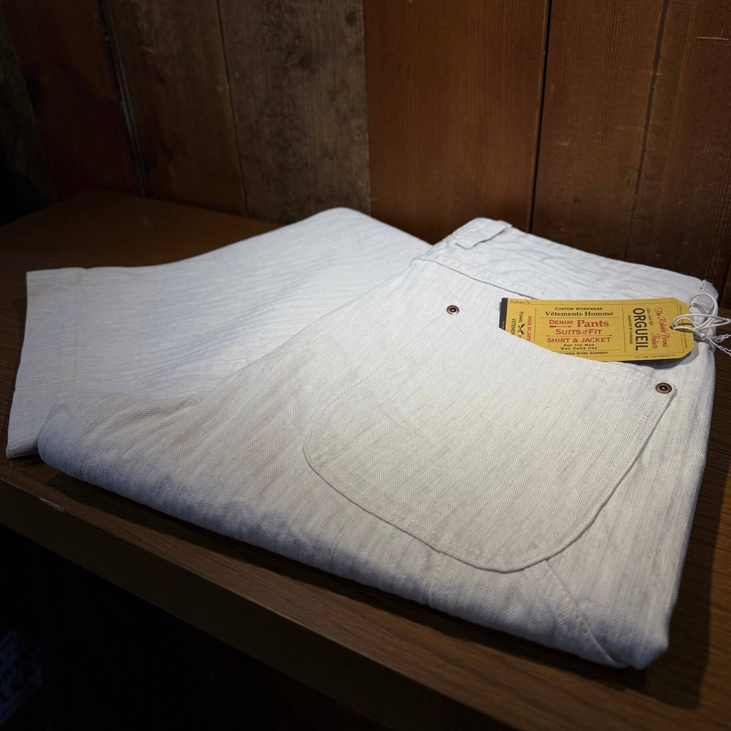 細目ピッチで味わいのある生成りのヘリンボーンを仕様することでペインターパンツの重たいイメージが解消されております。