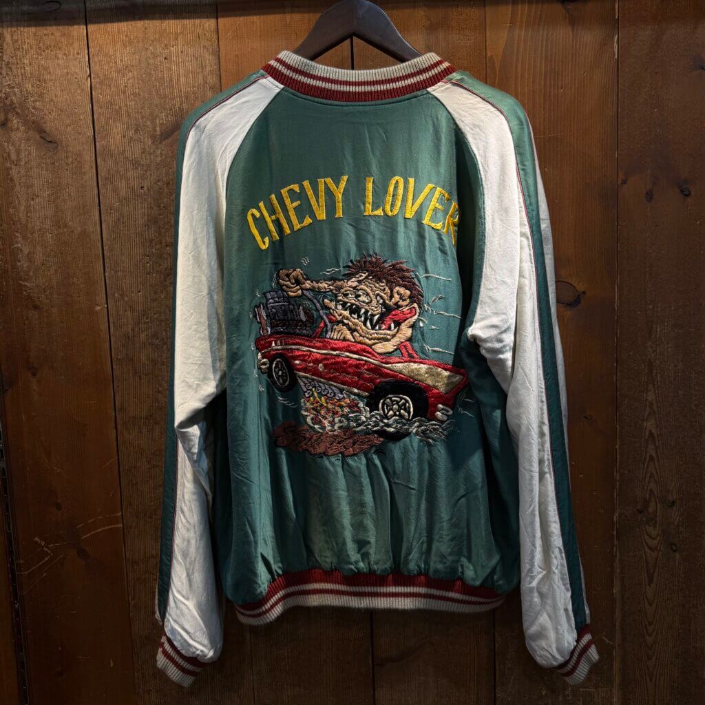 リバーシブル面は「シェビーラバー」と呼ばれる絵柄で、車好きな米兵のカスタムオーダーによるもの。Chevy とは Chevrolet(シボレー)の愛称。当時のアメリカのカスタムカーカルチャーが刺繍されたホットロッドなスカジャンに仕上がっています。