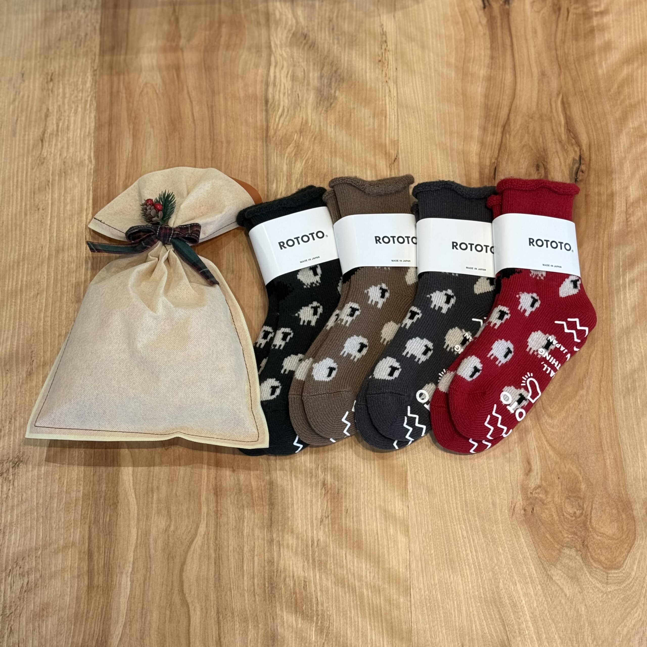 羊柄が特徴のルームソックス。毛質の繊細な17.5μ(マイクロン)のメリノウールとポリエステルの混紡糸が使用され、内側全体をパイル編みに仕上げることでクッション性と保温性が向上されています。