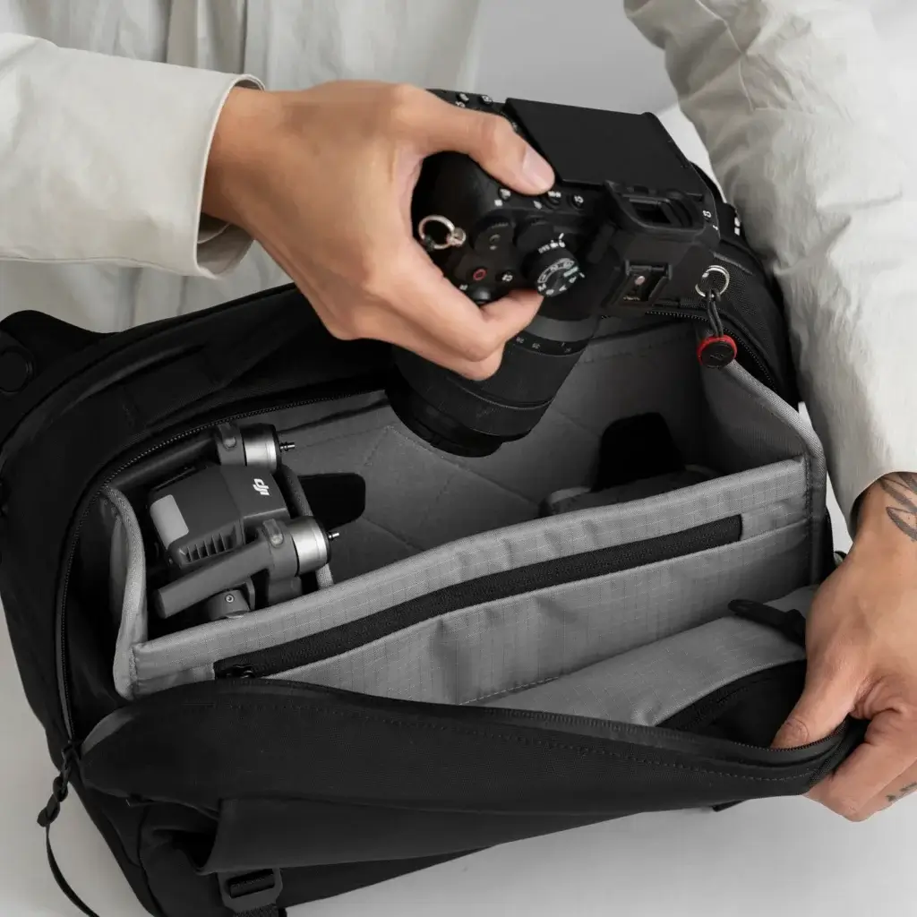 インナーには14インチノートPCを収納できるマグネット開閉のPCポケットがあり、また別売りのGRIP SLING 12 CAMERA INSERT(N0.7225012)を設置すると整理整頓がしやすくより快適に使用いただけます。