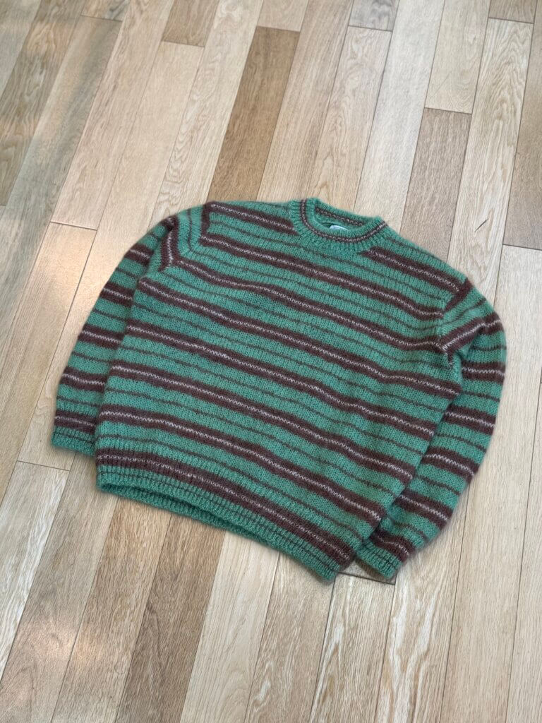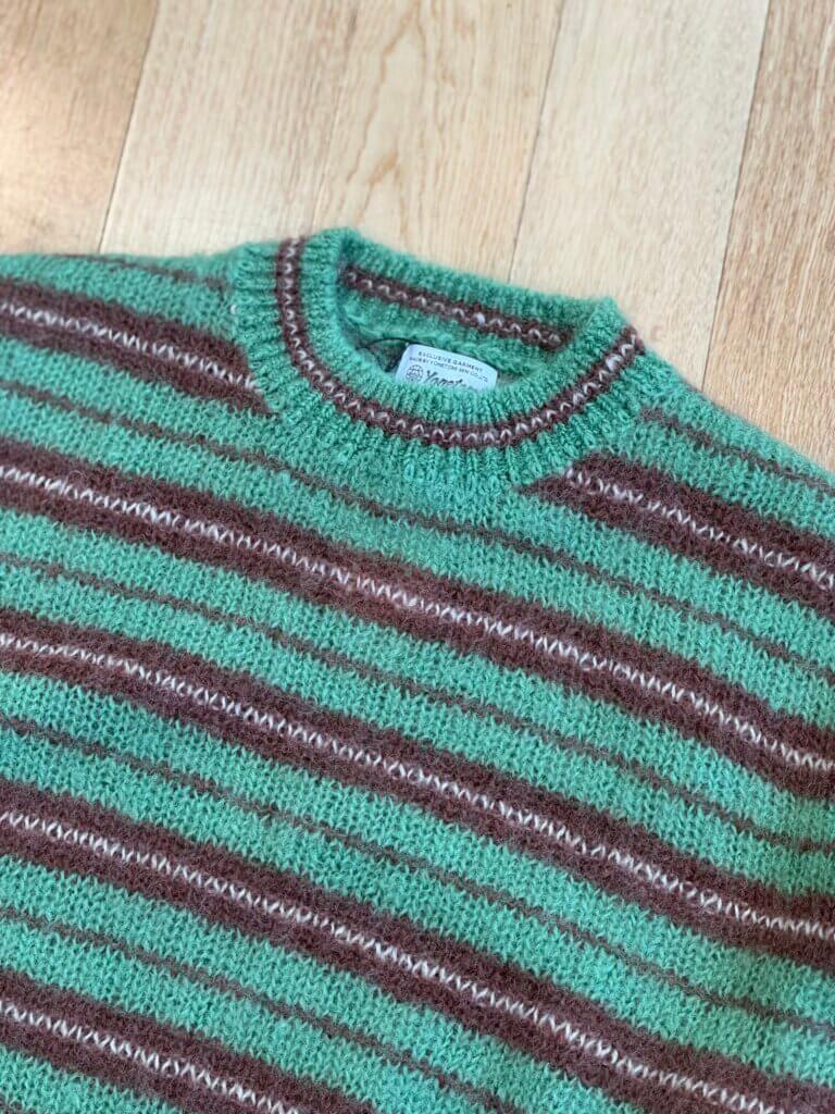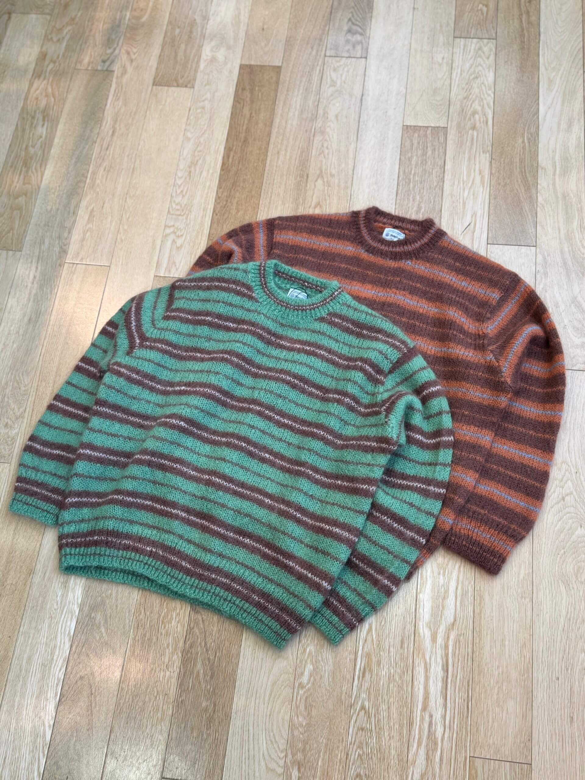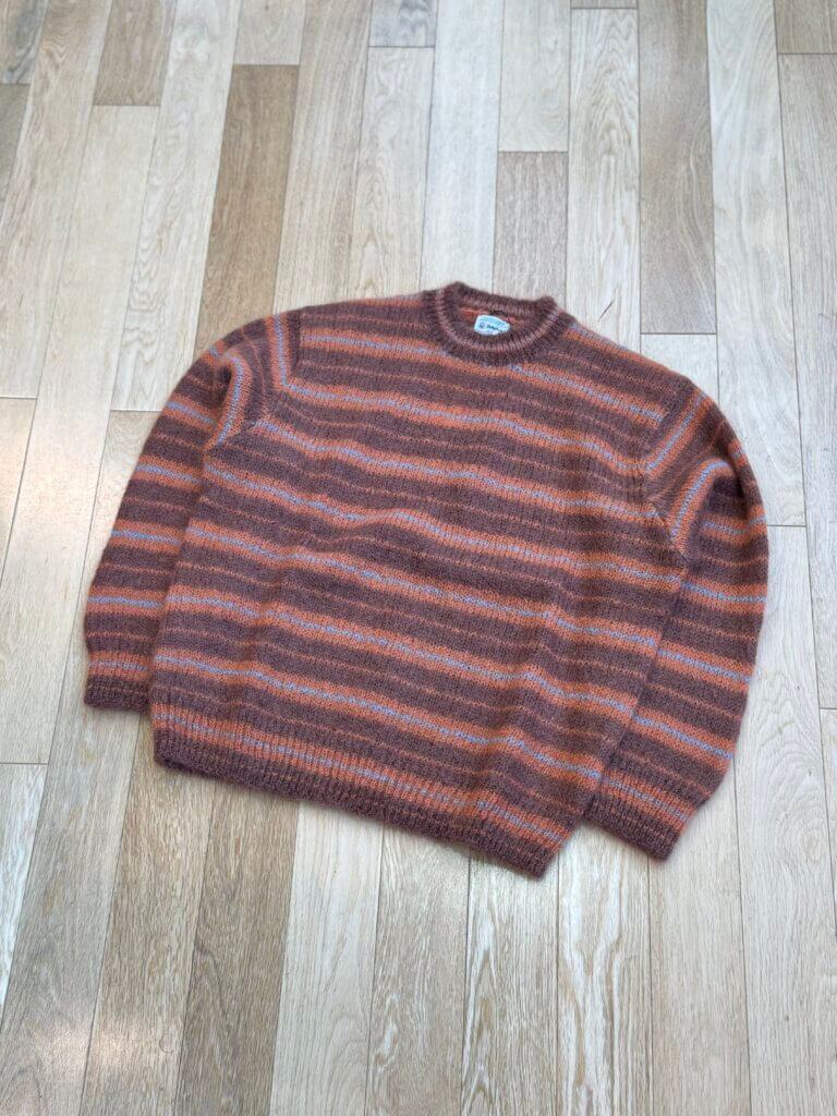 上質なモヘヤウール糸をが使用されている、ざっくりとレトロなボーダー柄で編まれたローゲージセーター。